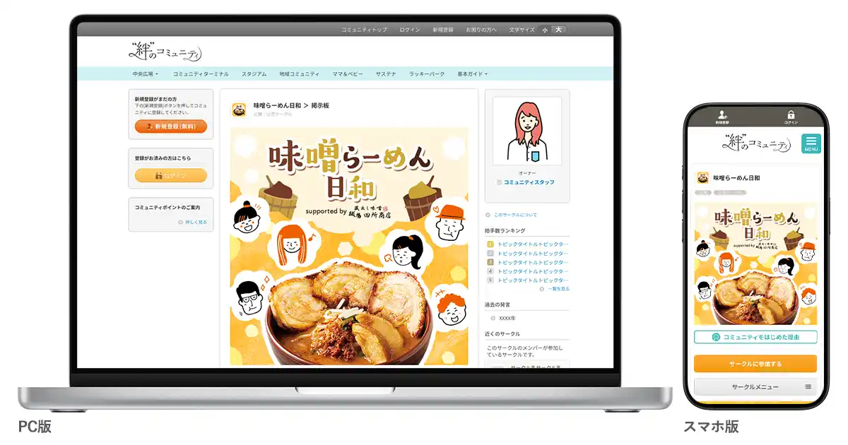 「味噌らーめん日和」は、味噌らーめんへの想いや“推しの味噌”について、自由に語り合えるオンラインコミュニティです。参加は無料で、「麺場 田所商店」のファンに限らず、味噌らーめんが好きな方であれば、どなたでも気軽に参加できます。 |