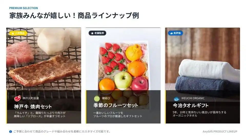 食品、コスメ、ガジェットなど、予算(3,000円~20,000円超)に合わせて従業員が「本当に欲しいもの」を選べるラインナップを構築できます 。単品タイプもカタログタイプも選択することが可能です。 |