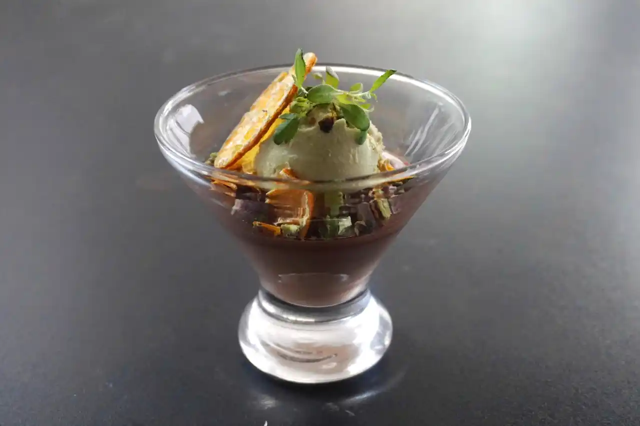 濃厚でなめらかなチョコレートのパンナコッタに、香ばしさとコクを感じるピスタチオアイスを合わせました。仕上げには国産みかんを丁寧に輪切りして乾燥させ、チョコレートのほろ苦さと甘みの余韻に、やさしい柑橘の香りを添えています。 |