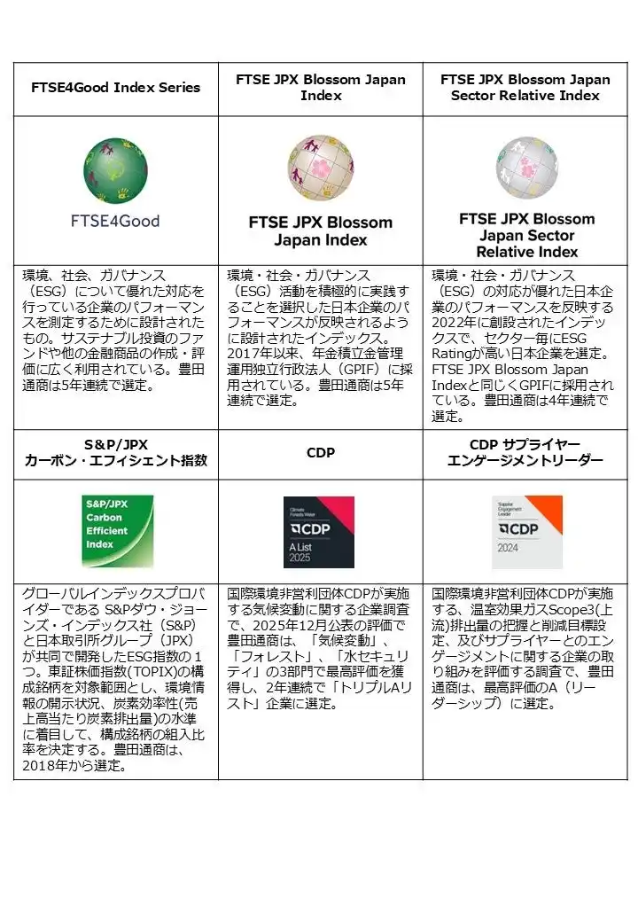 これらの継続選定、および「ESGスコア4.9」の評価は、サプライチェーン全体を視野に入れた環境・社会課題への対応をはじめ、事業を通じた持続可能な価値創出、ガバナンス体制の強化やステークホルダーエンゲージメントに関する豊田通商の取り組みが、総合的に評価された結果であると認識しています。 |
