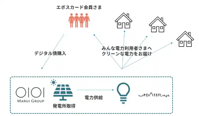 | 当社が掲げるインパクトテーマの一つが「脱炭素社会の実現」であり、今回、取得する再生可能エネルギー発電所で発電される電力は、すべて共創パートナーであるUPDATERに供給されます。UPDATERがエポスカード会員をはじめとした契約先のご家庭へクリーンな電気をお届けすることにより、2031年をゴールとする目標「CO2排出量100万t削減」へと進んでまいります。 | ||||||||||||