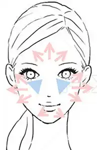 | 2.まず、頬の高い部分(ブルーの三角部分)につけて明るさを出し、外側に向かってやさしく叩き込むように伸ばします。 | ||||||||||||||||