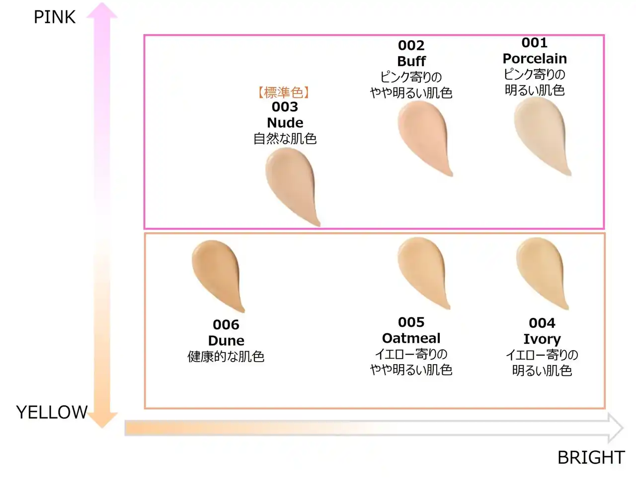 | 今回登場する新色はウォーム系のイエベ肌向けベージュ。明るい肌色の「004 アイボリー」、やや明るい肌色の「005 オートミール」、健康的な肌色「006 デューン」の3色。日本企画の商品だから実現した、アジア人にフィットする色味で色なじみがよく、ナチュラルなツヤ感のある肌をつくりあげます。既存色3色と合わせた6色展開だから、自分のなりたい肌に近づけるカラー選びが可能に。 | ||||||||||||||||