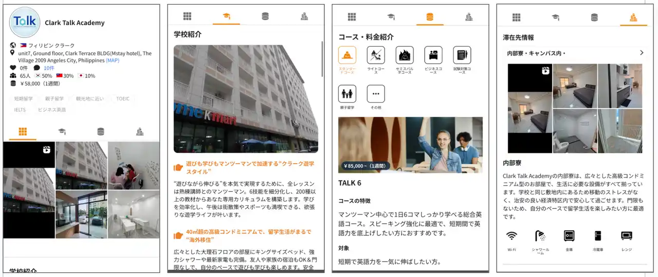 ネイティブキャンプ留学では、ユーザーが必要な情報を分かりやすく把握できるよう、常に丁寧で明確な情報提供を心がけています。Clark Talk Academyの詳細情報は、以下の4つのカテゴリーに分けて掲載しており、知りたい情報を的確にお届けします。 |