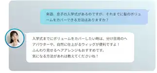 本サービスは、髪のお悩みが人に直接相談しづらい内容のひとつであること、また電話や対面での相談に心理的ハードルを感じる方がいらっしゃることから、安心してプライベートにお悩みを打ち明けられる相談環境として、AIチャット機能を導入しました。これにより、いつでも、24時間365日相談でき、最適なアドバイスを受けることが可能になります。 |