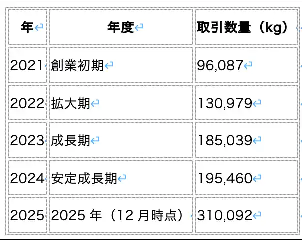 | 買いクルチェーン内の公式データでは、同社の取引量はこの5年間で約3.2倍、取引額は買いクルチェーン発足後から13,068%に拡大。2025年の輸出数量は31万kg超(2025年12月1日現在)に達している。 | |||||||||||||