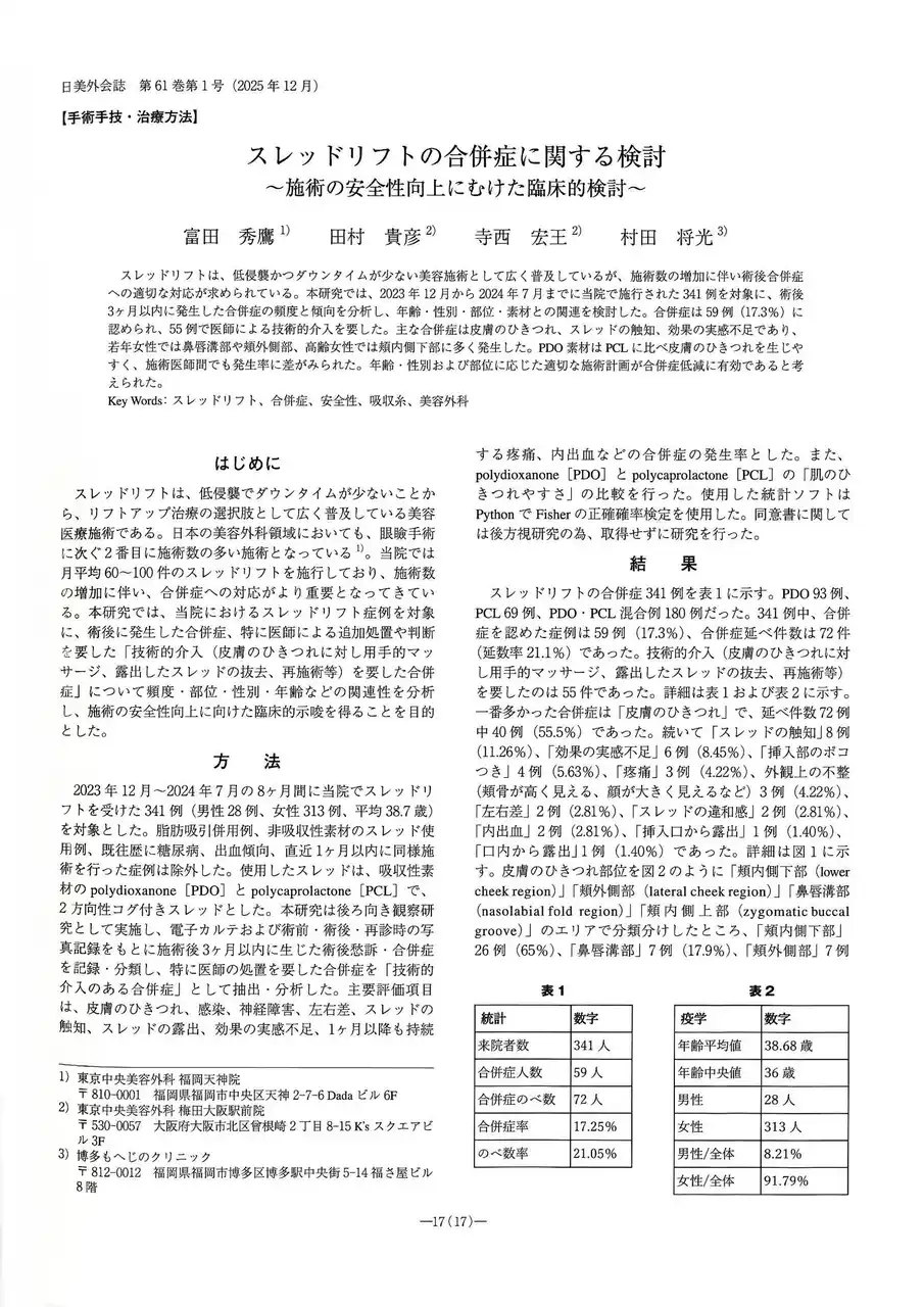 | いずれの研究も、特定の症例に限定したものではなく、日常診療に基づく臨床データを解析対象としており、同様の診療を行う医療機関においても参照可能な内容となっています。また、合併症や重篤な有害事象といったテーマを体系的に整理し、予防や対応策を学術的に検討する試みは、美容医療分野における安全性および信頼性の向上に資するものと考えられます。 | |||||||||||||||||||||||||||||||||||||||||||||||||||||||||||||||||||||||||||||||||||||||||||||||