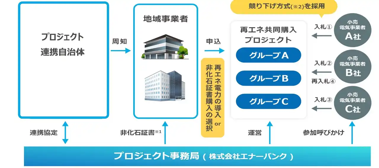 『共同購入による価格抑制』:複数事業者による一括調達で、経済的な再エネ導入を実現できます。 |