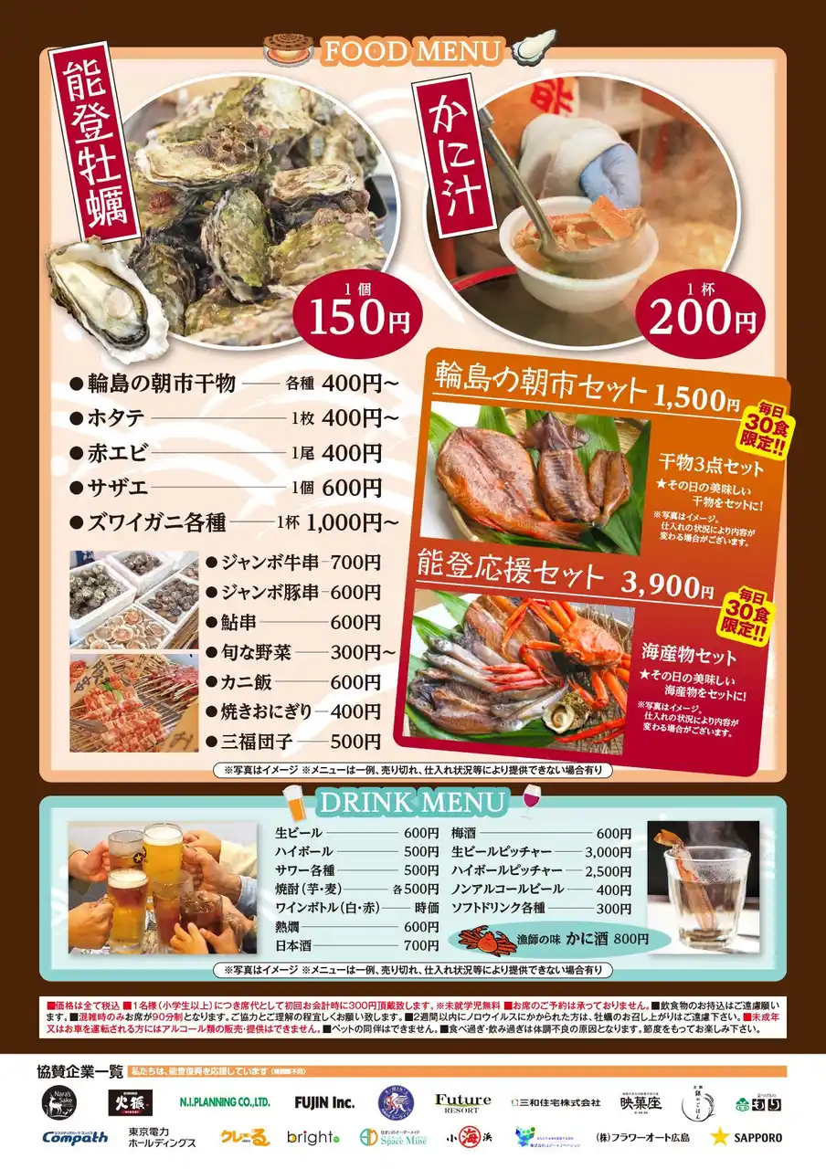 より多くの方に能登の魅力を感じていただくため、一部メニューを協賛価格でご提供いたします。 |