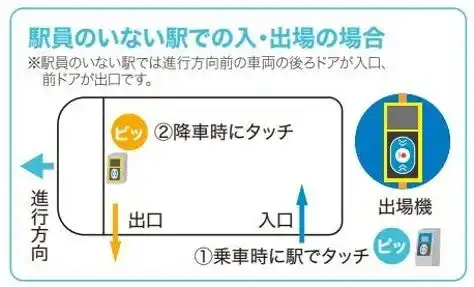 なお、駅係員のいない駅でお降りの場合は、お手数ですが進行方向前の車両にお越しいただき乗務員に提示してください。 |