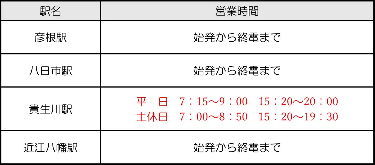 近江鉄道線の駅係員のいる駅(彦根駅・八日市駅・貴生川駅・近江八幡駅)の窓口で、下記の営業時間内に発売します。ICOCAとICOCA定期券いずれもデポジット500円を含めて発売します。デポジットはICカードを払いもどしする際に、無手数料で返金します。 |