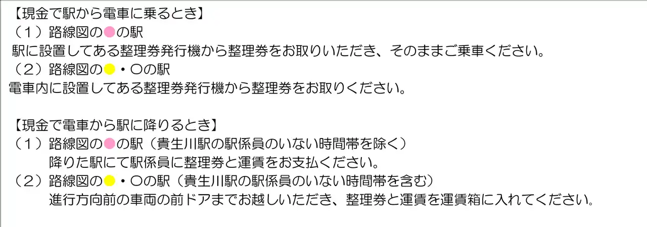なお、駅係員のいない駅でお降りの場合は、お手数ですが進行方向前の車両にある運賃箱に回数券を乗務員に見えるように入れてください。 |