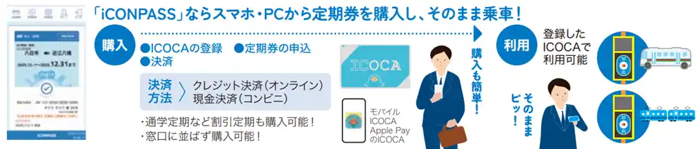 ICOCA Web定期券サービス「iCONPASS」で近江鉄道線の駅に行かなくても定期券を購入いただけます。また、「近江鉄道線と近江バス・湖国バス」「近江鉄道線と近江バス・湖国バス+JR線」など、複数の定期券が1枚のICOCAでご利用いただけます。 |