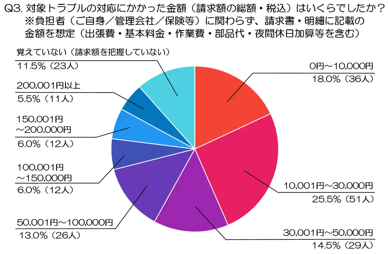 Q3.対象トラブルの対応にかかった金額(請求額の総額・税込)はいくらでしたか?※負担者(ご自身/管理会社/保険等)に関わらず、請求書・明細に記載の金額を想定(出張費・基本料金・作業費・部品代・夜間休日加算等を含む) |