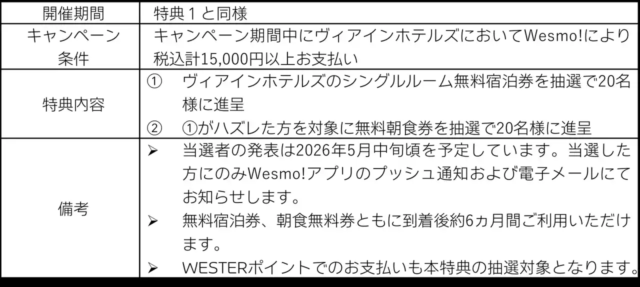 特典として期間中にヴィアインホテルズにおいてWesmo!によりお支払いいただくと、WESTERポイント(基本)が通常の14倍となる7%即時還元するほか、抽選により無料宿泊券や無料朝食券が当たるW特典を用意しています。 |