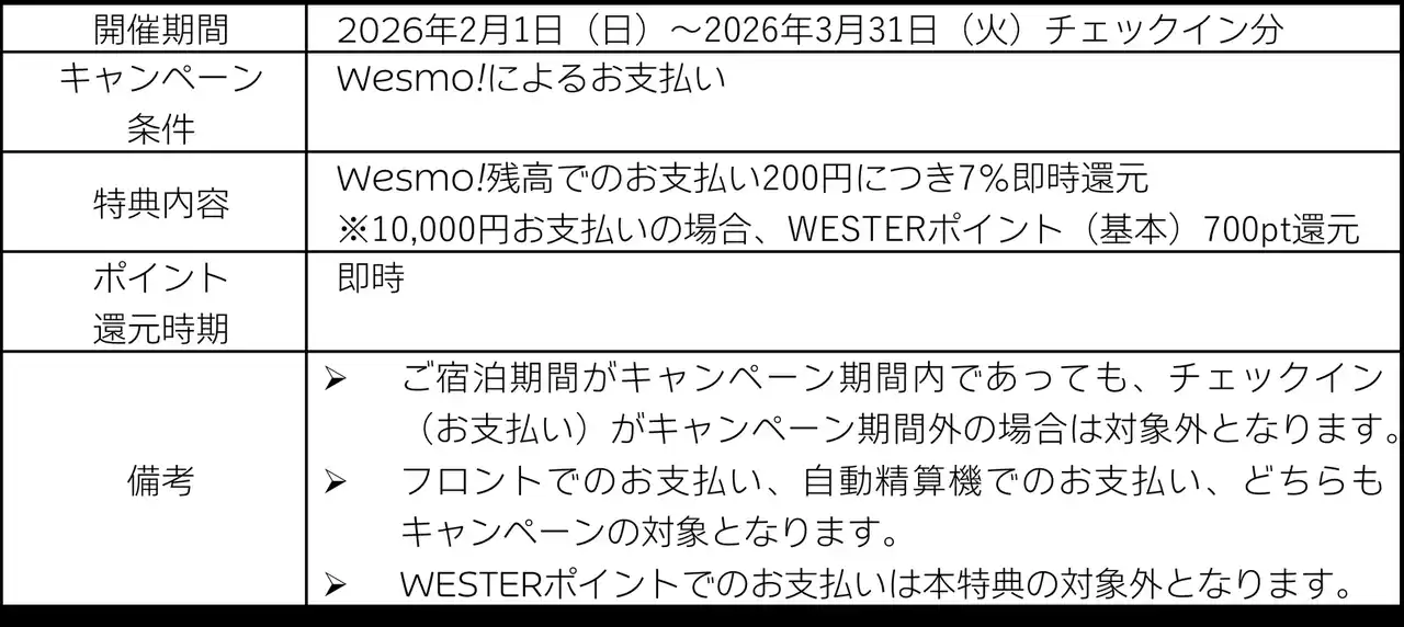 特典2:WESTERポイント7%還元のほか、Wesmo!残高によるお支払いを対象に抽選で無料宿泊券や朝食券があたるキャンペーンもダブル開催! |