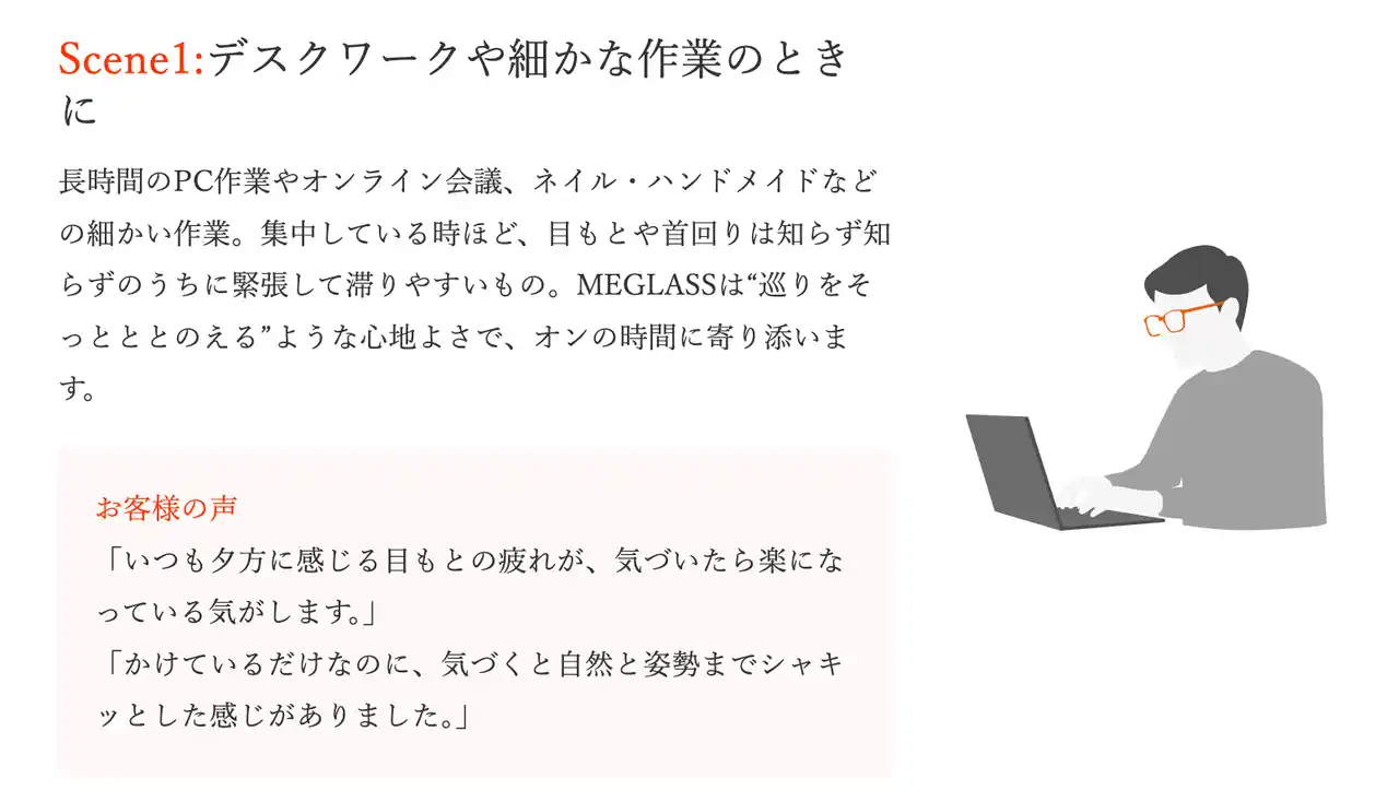 MEGLASSは、アイウェアという日常的な存在を通して、 「日常をととのえる」リカバリーアイウェアとして誕生しました。 |
