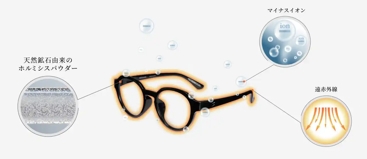 MEGLASSのフレームには、天然鉱石(シリカ・ジルコン)を主要成分とするホルミシスパウダーを練り込んだ特殊素材を採用しています。 |