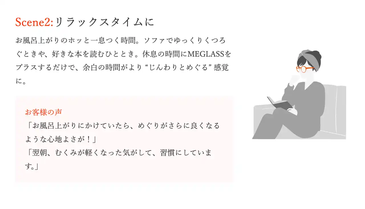 仕事中、休日のお出かけ、夜のリラックスタイムまで、幅広いシーンで気軽に取り入れていただけます。 |