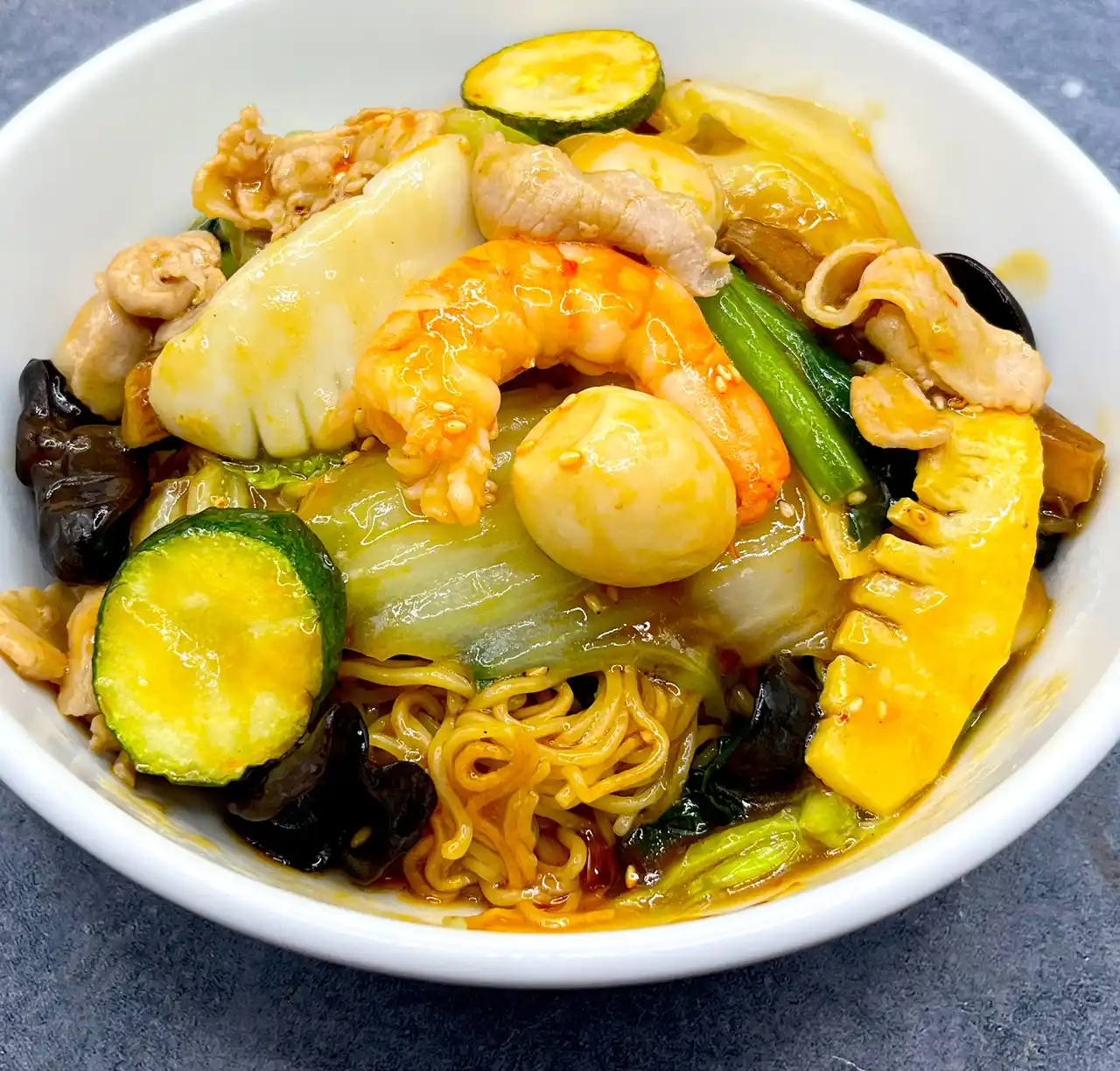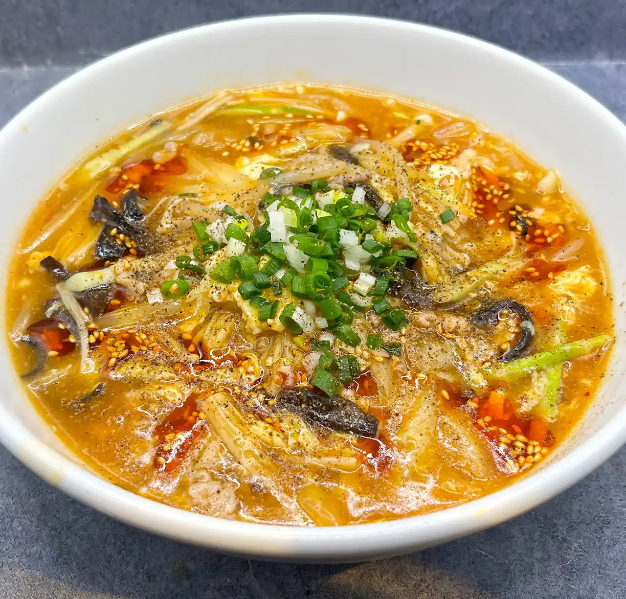 ロリーゼロと言われダイエットにも有効とされるこんにゃく麺をベースに『身土不二』(身体と土地は一体でありその土地で採れた旬のものを食べることが健康に繋がるという考え)をテーマに地元のお野菜を中心に集めた彩り豊かなトッピング食材をショーケースから自由にチョイスしていただけます!十数種の香辛料を独自にブレンドしたコラーゲンをたっぷり含んだスープは7 種類!辛さも0 辛~ 5 辛までお選びいただけ組み合わせは無限大!!太帯春雨のモチモチと細春雨のツルツルを両方ともお楽しみいただけるハーフ&ハーフに無料で変更することが可能です! |