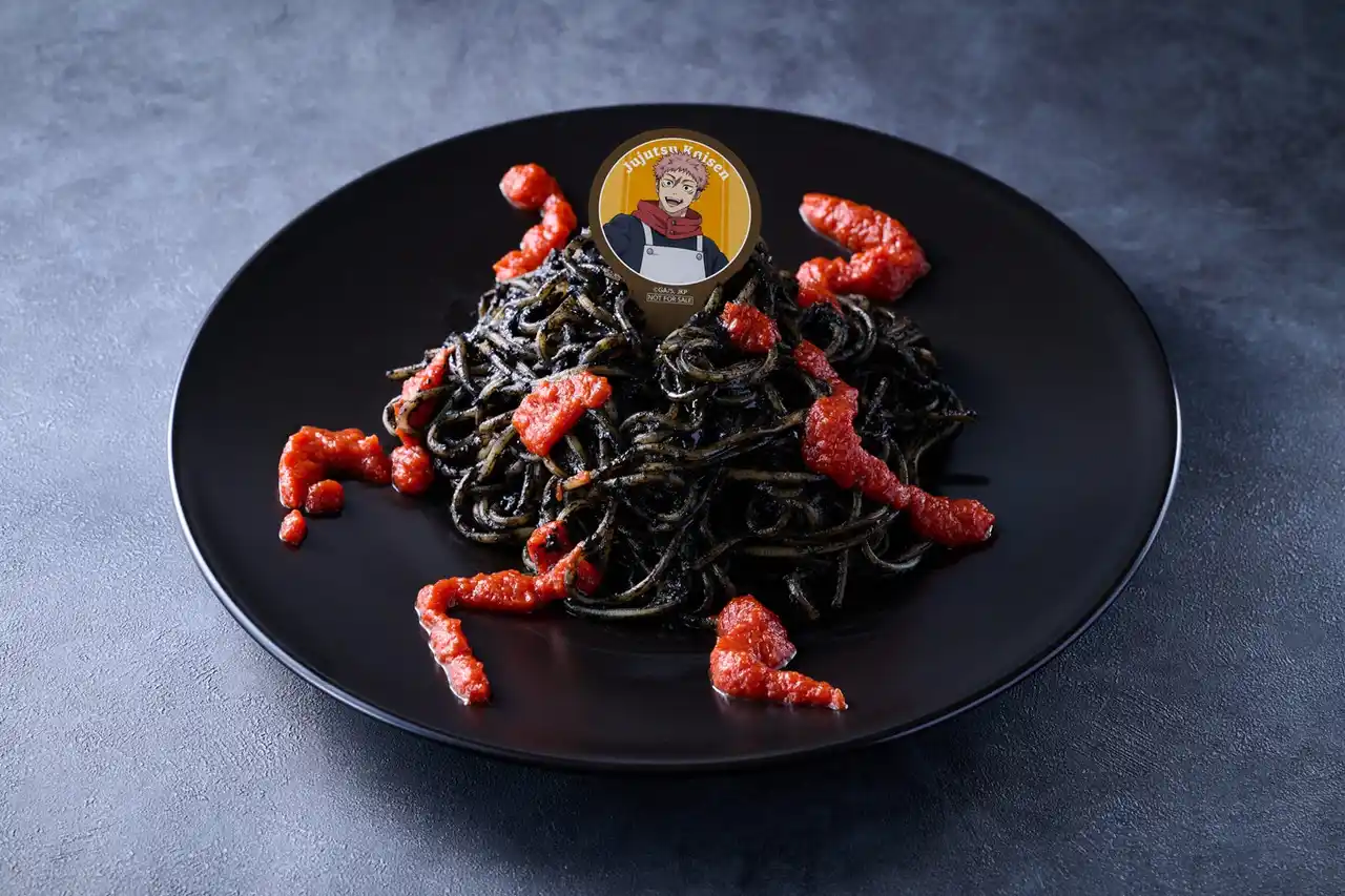 | 「虎杖の「黒閃」パスタ」や、「伏黒の十種影法術:玉犬「渾」パルフェ」など、キャラクターをモチーフにした様々なフードメニューやドリンクメニューが登場! | |||||||||