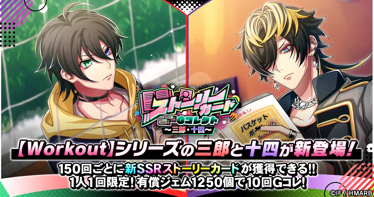 新ストーリーカード「SSR【Workout】山田三郎」と「SSR【Workout】四十物十四」を獲得することができるGコレクトを開催しています。Gコレクトはジェムのほか、専用チケット「ストーリーGコレチケット(vol.4)」各種を使うことでも回すことができ、ビンゴミッションとログインボーナスで最大150回分のチケットを獲得できます。 |