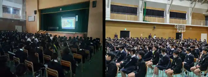 江原市長への表敬訪問に合わせて、深川小学校にてアニメ上映会を開催し、全校児童約400名が参加しました。上映に先立ち、長門市総合文化財センター「ヒストリアながと」の職員による解説が行われ、舞台となった青海島について、国の天然記念物に指定されている景勝地であることや、かつての捕鯨の歴史などを学びました。アニメの上映が始まると、子どもたちは真剣な表情で見入っており、狸のかわいらしい描写の場面では笑い声も上がるなど、会場は和やかな雰囲気に包まれました。 |