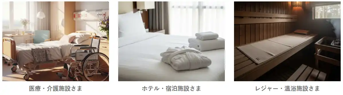 安定品質の洗濯と選べる機器・プランで、ホテルや旅館などの宿泊施設のほか、福祉施設やレジャー・温浴施設など、業務用洗濯の悩みごと解決とコストカットを同時に実現しています。 |