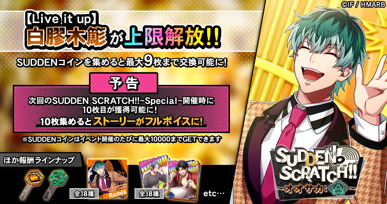 イベント期間中、KILLER SCRATCH!!をプレイするとライズ消費量に応じた確率でSUDDEN SCRATCH!!が発生します。SUDDEN SCRATCH!!をプレイすると、通常の報酬アイテムの他、限定アイテム「SUDDENコイン」を獲得することができます。「SUDDENコイン」を集めることで、「A.R.B remix」楽曲やレイズキー、オオサカ・ディビジョンのデコステッカーに使えるブースターなどと交換することが可能です。また、ストーリーカード「SSR【Live it up】白膠木簓」が上限解放され、最大9枚まで獲得できます。さらに、SUDDEN SCRATCH!!~Special~の開催時には10枚目が獲得可能となり、10枚集めるとカードストーリーがフルボイスに! |