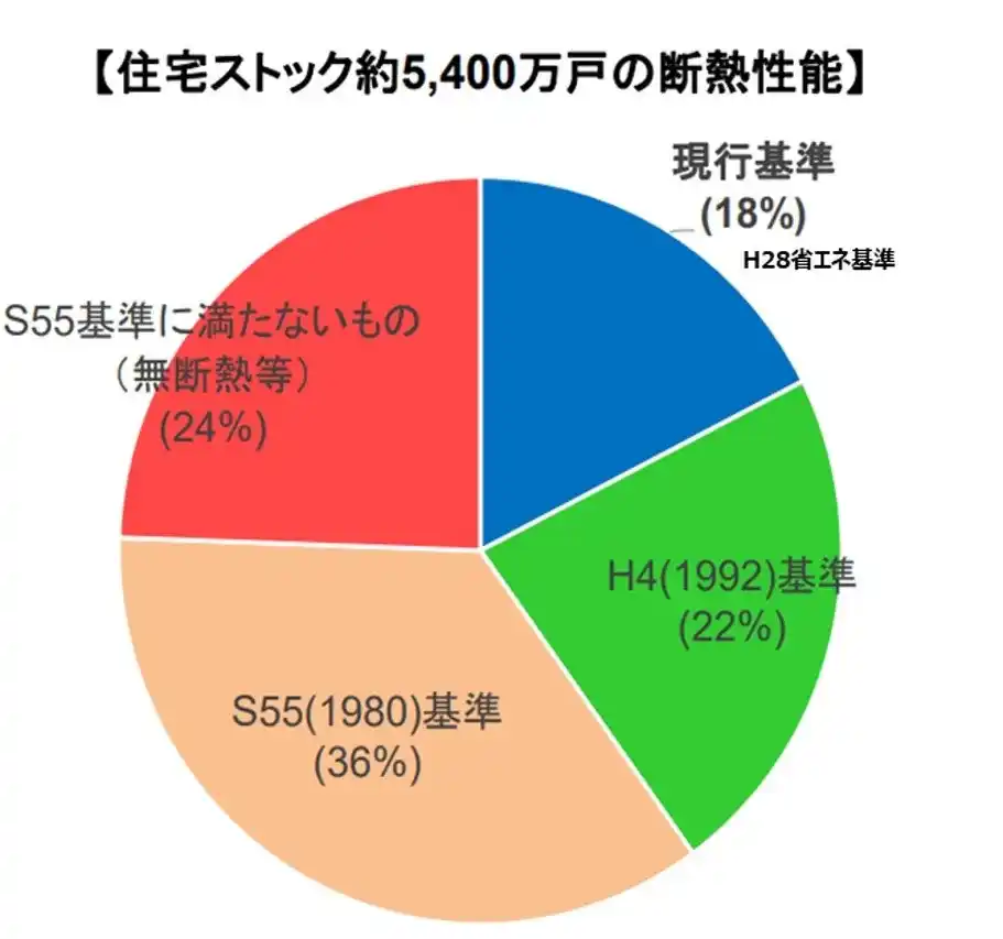 2050年カーボンニュートラルの達成には、CO2総排出量の1/7を占める家庭部門の脱炭素達成が重要ですが、現行の省エネ基準を満たさない住宅が2024年時点で約82%(約4,400万戸)、そのうち無断熱の住宅は約24%(約1,300万戸)と推計されています。この未達分の住宅を新築住宅だけで置換できれば理想ではありますが、現在の新築住宅着工ペース(年80万戸、2040年には年50万戸に減少との予測)では2050年のカーボンニュートラル達成には間に合わないため、既存住宅の断熱・省エネリフォームが必須となっております。 |