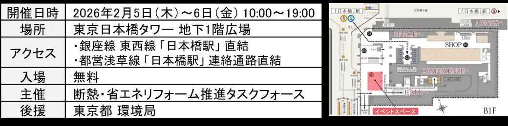 このイベントが、2月5日(木)~2月6日(金)に、東京日本橋タワー地下1階広場に登場します。リフォームや断熱関連のニーズが顕在化していない層、特に戸建て所有者およびファミリー層に向けて、断熱リフォームへの気づきと必要性の理解を促進してもらうための、コンテンツを出展します。 |