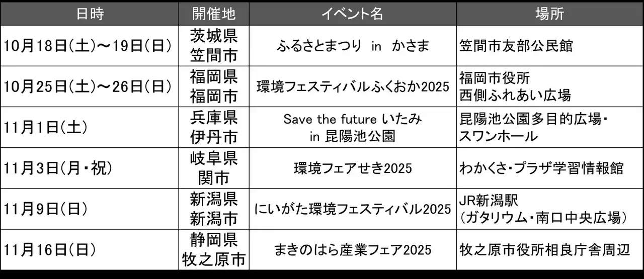 茨城県笠間市の「ふるさとまつり」では約2,900名、 福岡県福岡市の「環境フェスティバルふくおか」では約1,700名に、 兵庫県伊丹市の「save the future いたみ」では約600名に、 岐阜県関市の「環境フェアせき」では約800名に、新潟県新潟市の「にいがた環境フェスティバル」では約500名に、静岡県牧之原市の「まきのはら産業フェア」では約1,500名にご来場いただきました。 |