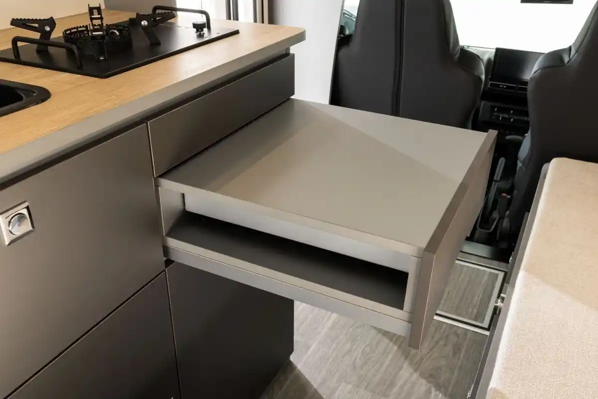 ・電動サイドオーニングで車外でも快適に ・マグネット式キッチンウォールで、調理器具や棚を自由にレイアウト可能 ・引き出し式テーブルで、限られたスペースでも食事や作業が快適 ・ベンチ下収納やオーバーヘッドキャビネットなど、収納力も抜群 |