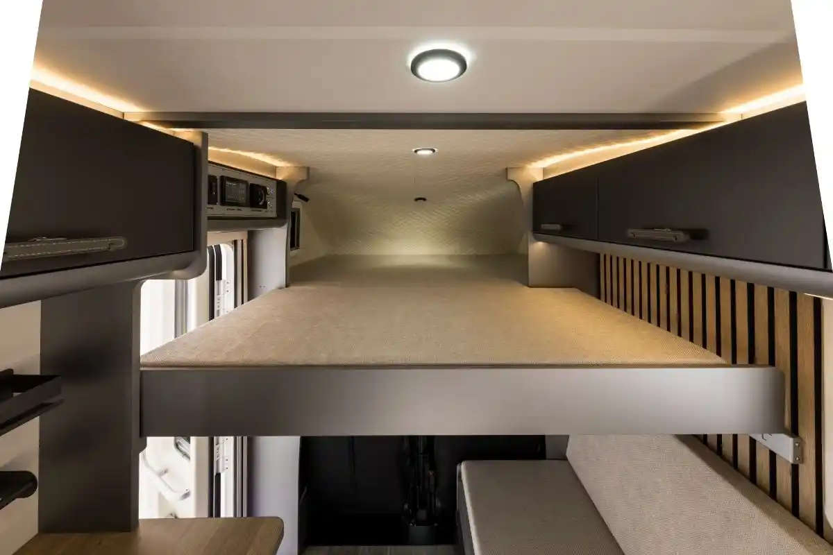 引き出しタイプのバンクベッドを搭載。コンパクトなサイズの車内でも、しっかりと就寝スペースを確保。 |
