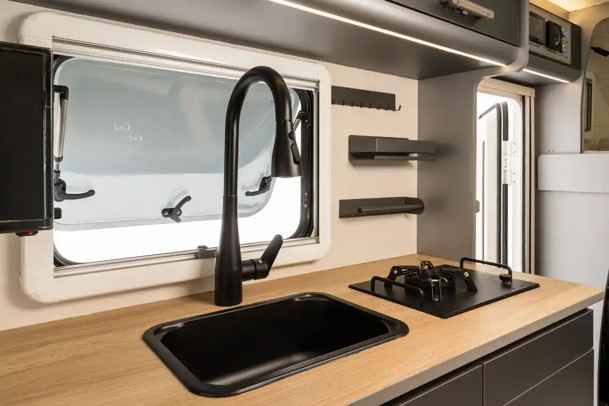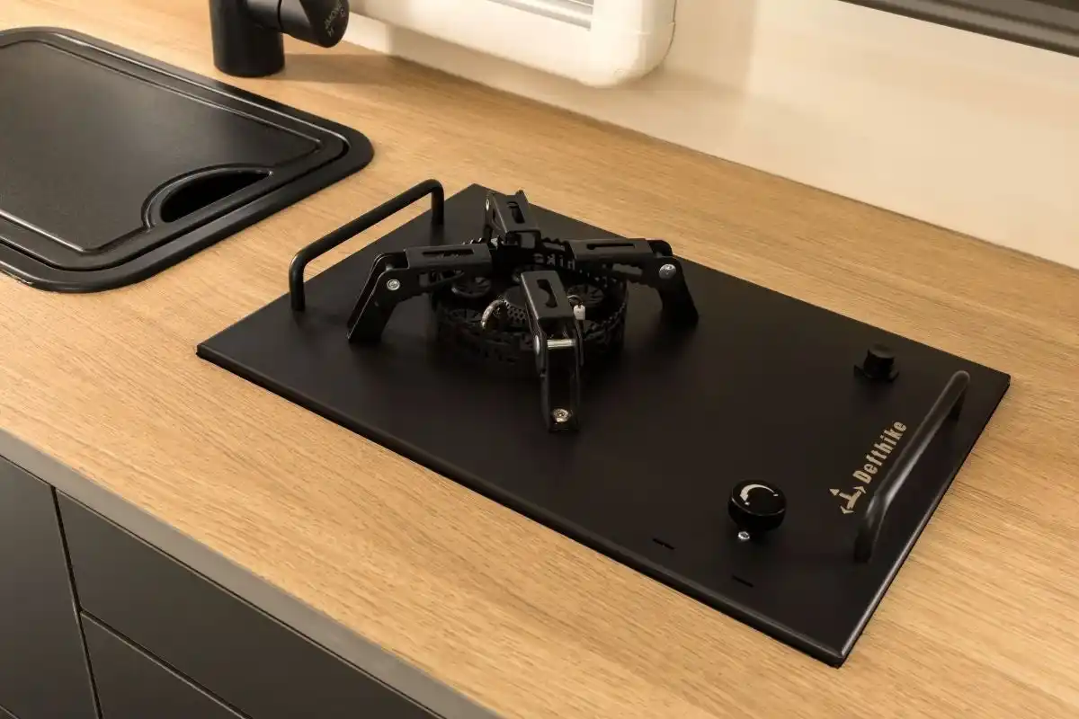 キッチンには取り外し可能なコンロユニットを搭載。 車内での調理はもちろん、外に持ち出して景色を楽しみながらのアウトドアクッキングも可能です。 使い終わったら簡単に収納できるため、スペースを有効活用できます。 |