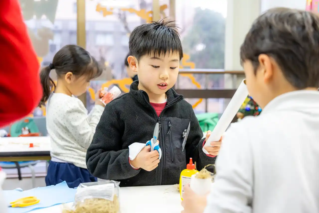 トイレットペーパーの芯や空き缶などの廃材を使い、自分だけのオリジナル楽器を制作。環境への意識を育みながら、素材によって変わる音色の違いを英語で学びました。 |