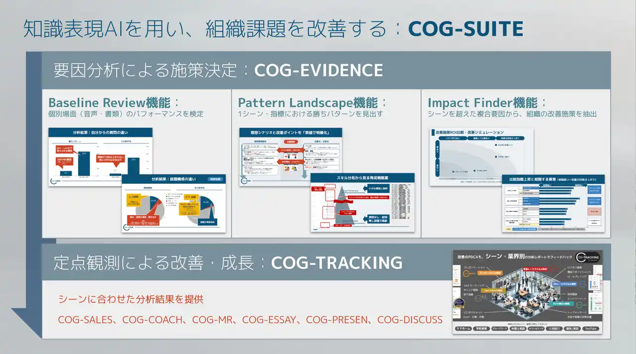 今回のBaseline Review機能は、組織内の成長・改善を感覚の判断ではなく、客観的なデータを下に判断していくための経営層・管理職向けサービスCOG-EVIDENCE(60万円+税~)から一部機能を切り出したものです。この利用をきっかけとし、Pattern Landscape/Impact Finderを含むCOG-EVIDENCE全体の利用へ段階的に接続し、組織課題の特定から改善施策の抽出まで一貫して支援していきます。あわせて、専門家と連携したPDCAサイクル構築(パートナープログラム)も順次発表予定です。 |