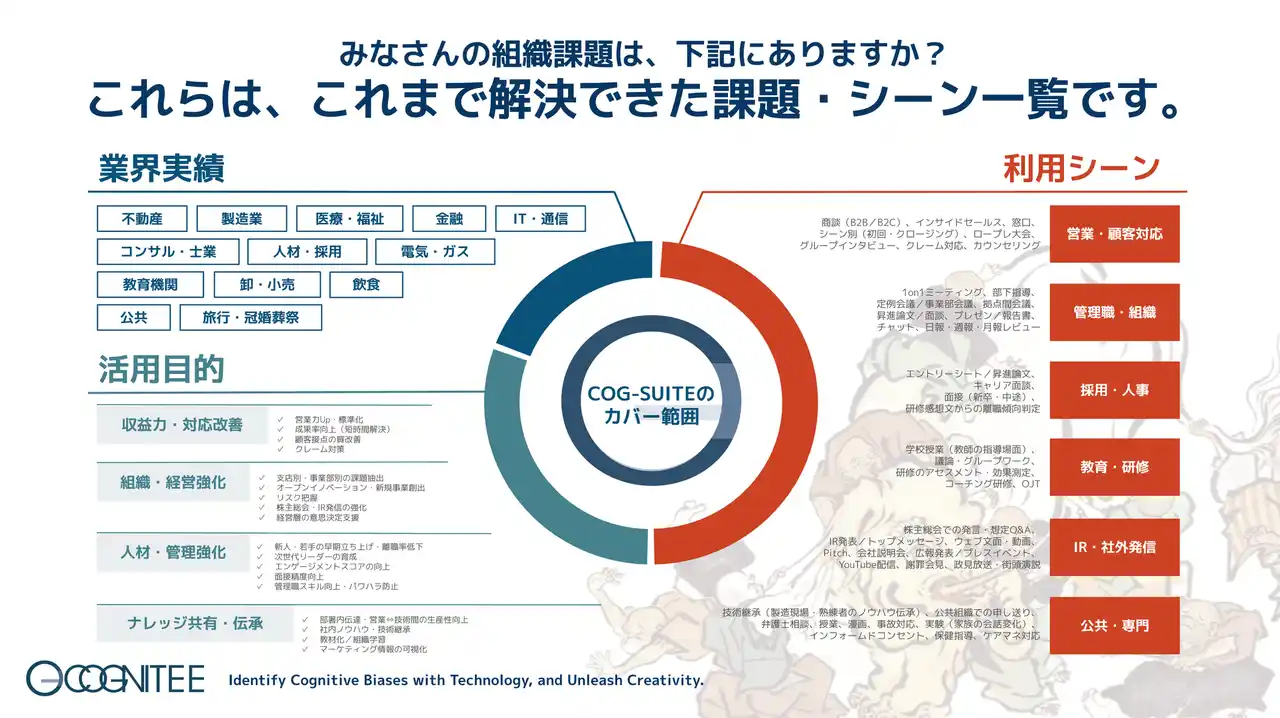 コグニティは「技術の力で、思考バイアスなき社会を。」というパーパスの下、人の思考がもたらす限界としてのバイアス(思い込み・勘と経験での判断)を無くしていくための技術とサービスを展開しています。 |