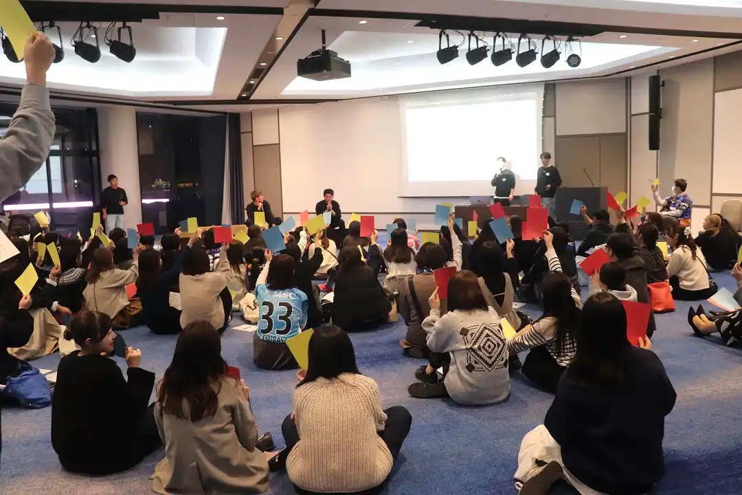 ⚫︎2025シーズン振り返りの後は、「本音に触れる時間ー距離が一番近い質問コーナー 」と「笑顔を共有する時間ー笑顔と一体感が生まれるTNKオリジナルのクイズコンテンツ」を実施。TNKらしい温かみのあるコンテンツで会場が一体となりました。 |