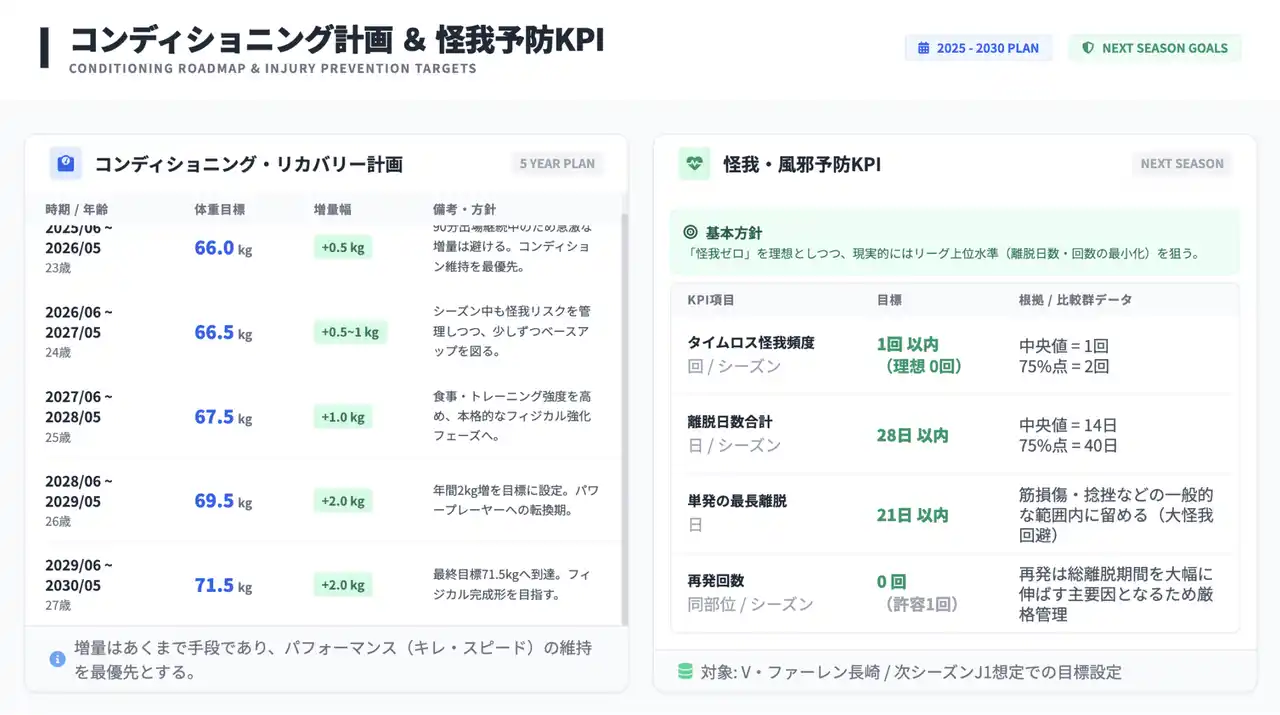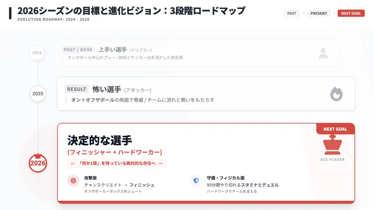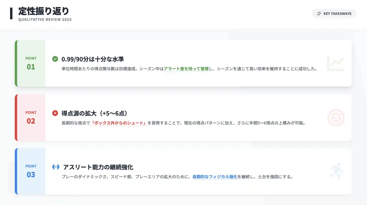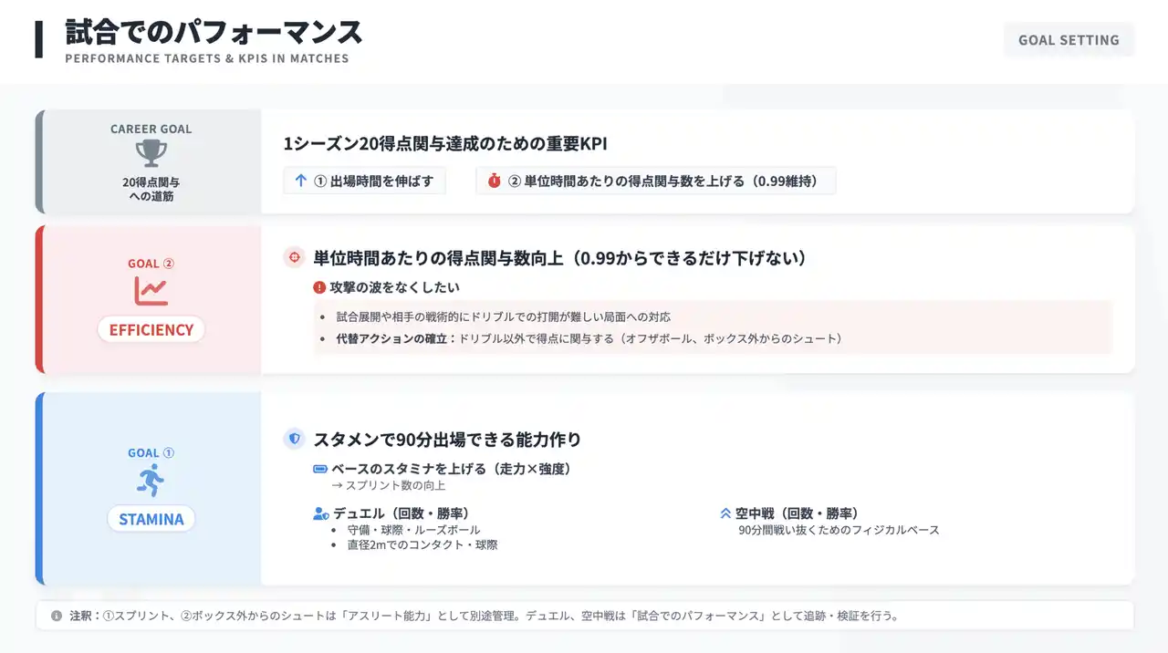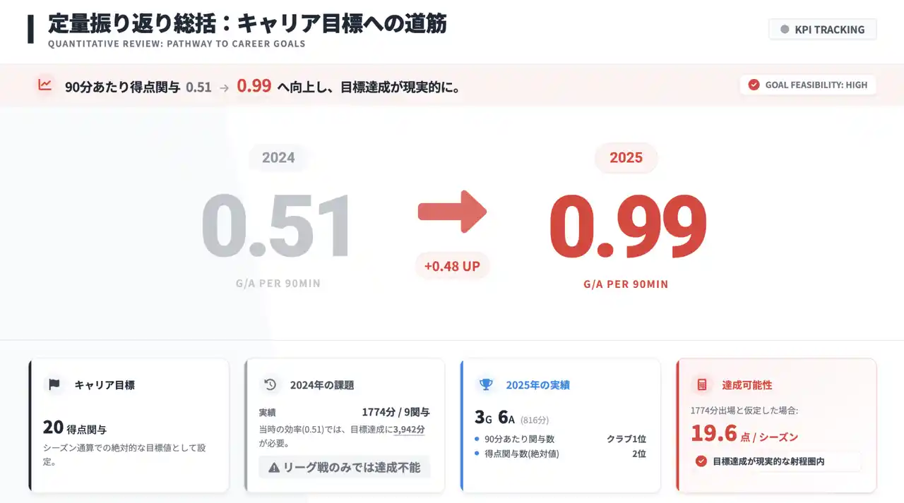「シーズン20得点関与」というキャリア目標に対し、現在地と来季の課題(出場時間の最大化など)を明確に提示し、来季への期待感を醸成しました。 |