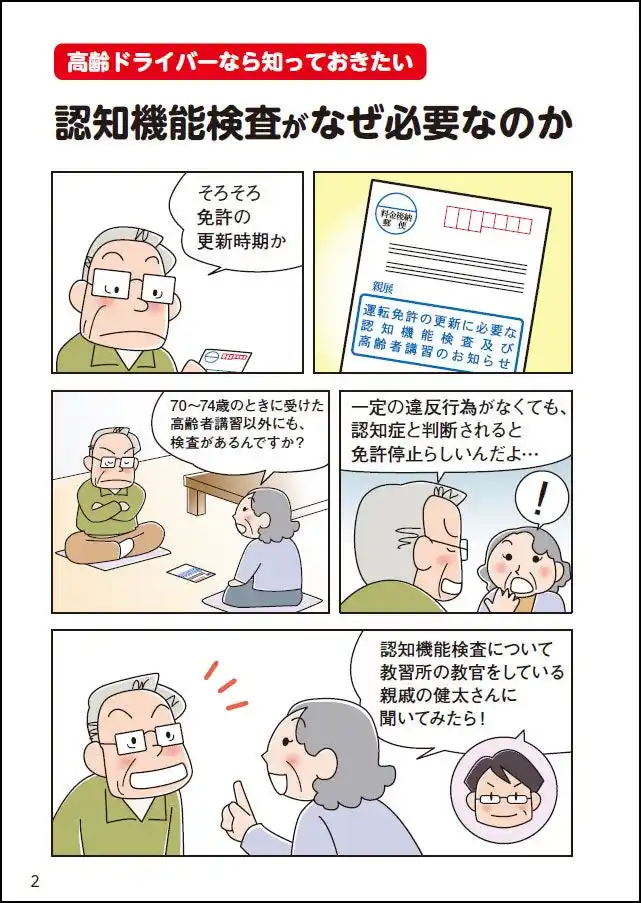 「なぜ認知機能検査がひつようなのか」「どんな検査を、何分くらいやるの?」といった基本的な疑問から、合格後の手続きまでを分かりやすいマンガで解説しています 。 |