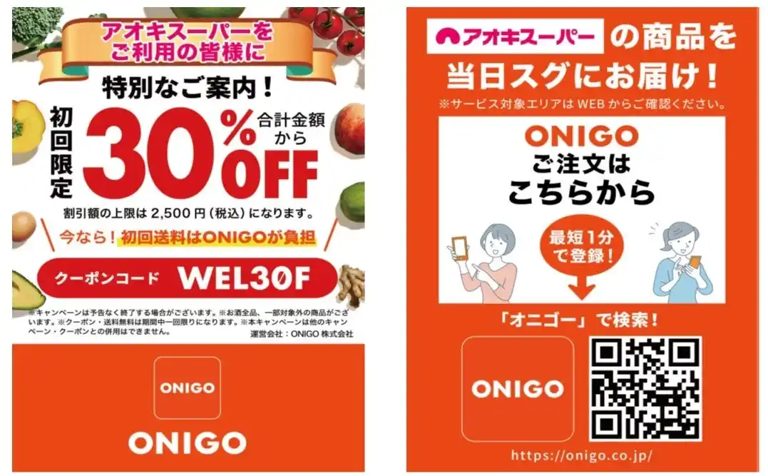 三河エリアでのサービス開始を記念し、初回のご注文に限り『ONIGOアプリ』表示価格から最大30%OFFとなる初回限定キャンペーンを全エリアで実施します。 |