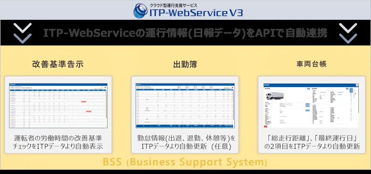 富士通製デジタコ(ITP-WebService)の運行情報(日報データ)をAPIでBSSデータと自動連携可能。 |
