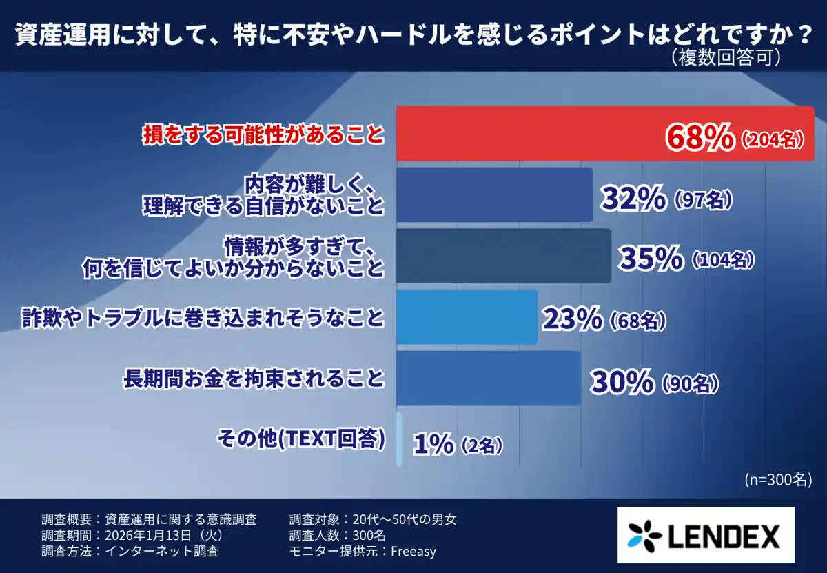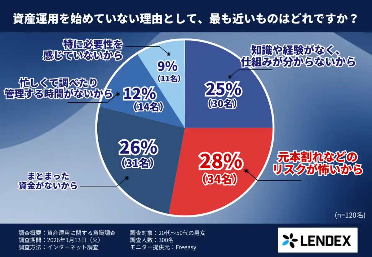そこで株式会社LENDEX(本社:東京都渋谷区、代表取締役:中村 智)は、20~50代の男女300名を対象に、資産運用を始めていない理由や、心理的ハードルに関する意識調査を実施しました。 |