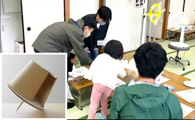 | 風車の模型を見比べながら、ブレード型、パンタレイ型、サボニウス型の型式の違いによる回り方の変化を観察しました。参加者は紙コップを使って、サボニウス型風車の製作体験も行いました。 | |||