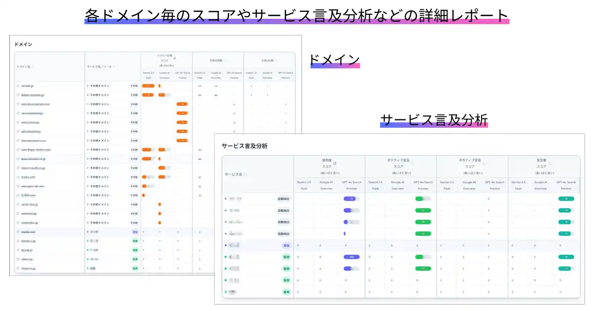 | 優先度スコア、ポジティブスコア、ネガティブスコア、言及量スコア、ドメイン引用スコアなど多角的指標でAIの回答をスコア化 | |||