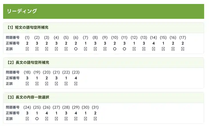 また、Reading/Listeningについては、設問ごとの正誤もPDF上で確認できます。 |