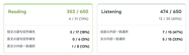 一方で、合否やスコアの目安だけでなく、「どの形式が弱いか」「どの観点が伸びしろか」「合格まで何が足りないか」を具体化できると、対策は格段に立てやすくなります。 |