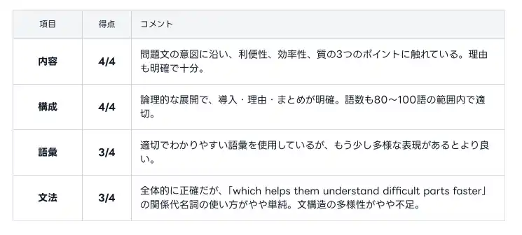 (3)Writing:公式4観点(内容/構成/語彙/文法)で内訳表示 |