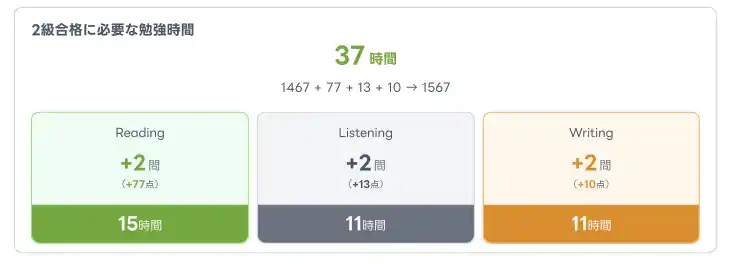 詳細PDFでは、自己採点シートの結果(Reading/Listening/Writing)に加え、弱点が分かる分析(大問別・観点別)や、不合格時には合格に必要な勉強時間の目安(合格時間ナビ:バランス型、技能別内訳)も表示します。試験直後の振り返りを「画面で見るだけ」から「PDFで保存して見返す」形に拡張し、次の学習に繋げやすくしました。 |